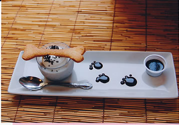 本橋は、愛犬と飼い主さんをイメージして骨の橋をゴマプリン(看板犬が黒のため)に架けました。サッパリとしたゴマプリンにゴマソースをかけて、骨型クッキーをつけてお召し上がり下さい。